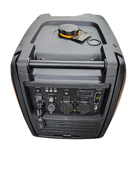 輸出功率為4千瓦,具備手拉啟動、電啟動和遙控啟動三種啟動方式。機身設(shè)有旋轉(zhuǎn)開關(guān)、手拉柄、加機油口等。配備消音器及防燙護罩,帶有兩個輪子,方便移動。面板上有兩個USB插孔、一個點煙器12V輸出、兩個230V輸出通用五孔插座、一個電壓表以及交流輸出兩個插孔和接地螺絲。